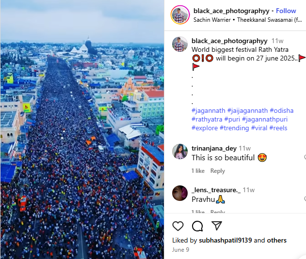 എന്നാല് ഈ വീഡിയോയുടെ വസ്തുത മറ്റൊന്നാണ്. രാഹുല് ഗാന്ധിയുടെ 'വോട്ടര് അധികാര് യാത്ര'യില് നിന്നുള്ള ദൃശ്യങ്ങള് എന്ന പേരില് എഫ്ബിയില് ഷെയര് ചെയ്യപ്പെടുന്ന വീഡിയോ വസ്തുതാ പരിശോധനയ്ക്ക് വിധേയമാക്കി. ഇതില് വ്യക്തമായത് ഒഡിഷയിലെ പുരിയിലുള്ള വിഖ്യാതമായ ജഗന്നാഥ ക്ഷേത്രത്തിലെ രഥോത്സവത്തിന്റെ ഭാഗമായുള്ള റാലിയില് നിന്നുള്ളതാണ് ഈ ദൃശ്യം എന്നാണ്. പുരിയിലെ സമാന നിര്മ്മിതികള് പ്രചരിക്കുന്ന വീഡിയോയിലും കാണാം. മാത്രമല്ല, പുരിയില് നിന്നുള്ള വീഡിയോ എന്ന തലക്കെട്ടില് ഇതേ ദൃശ്യങ്ങള് ഇന്സ്റ്റഗ്രാമില് മുമ്പ് ഏറെ ഷെയര് ചെയ്യപ്പെട്ടിരുന്നതുമാണ്. എന്നാല് കൃത്യമായി ഏത് ദിവസമാണ് ഈ ദൃശ്യങ്ങള് പകര്ത്തിയതെന്നും സോഷ്യല് മീഡിയയില് ആദ്യമായി പോസ്റ്റ് ചെയ്തതെന്നും വ്യക്തമല്ല.