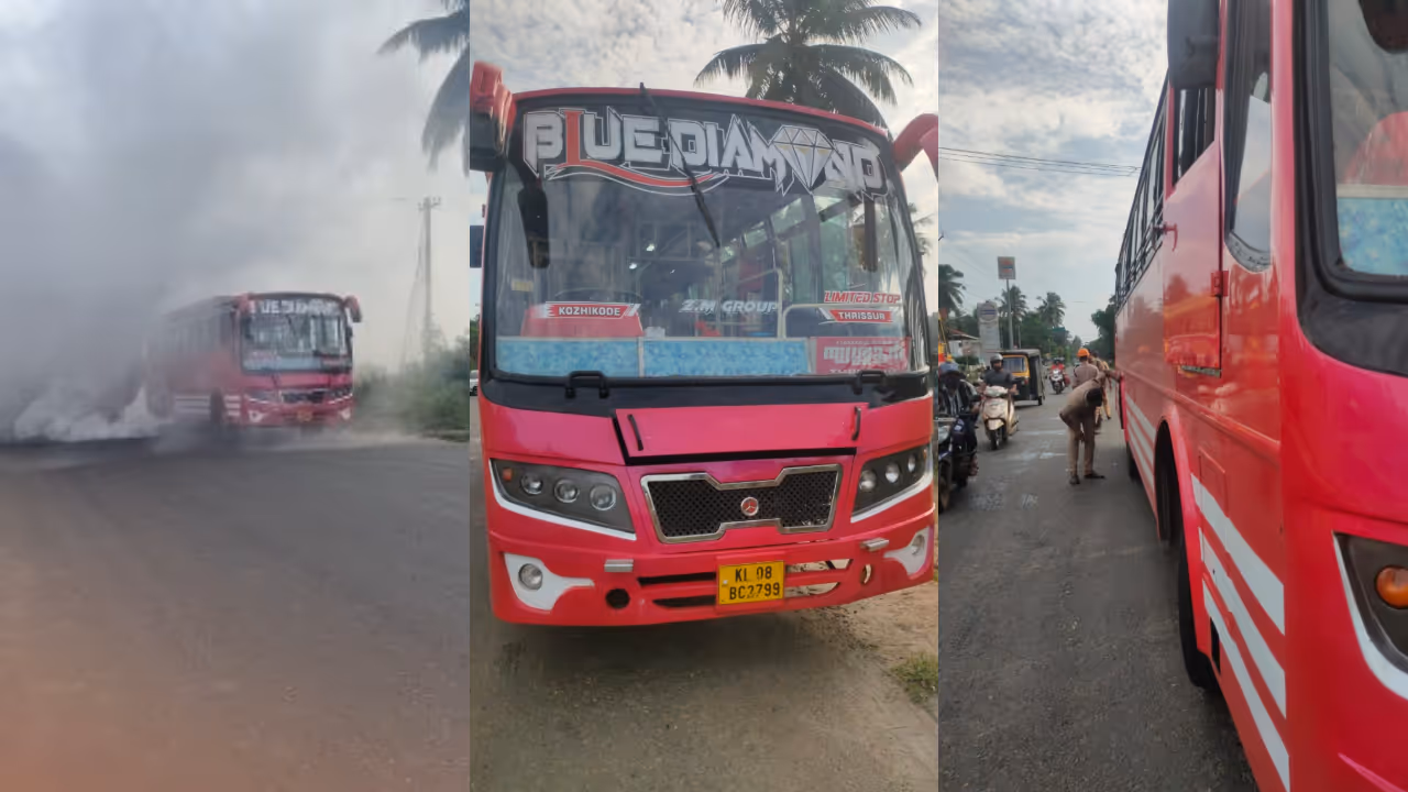 കോഴിക്കോട് നിന്നും തൃശൂരിലേക്ക് പോവുകയായിരുന്ന ബ്ലൂ ഡയമണ്ട് ബസിന്റെ ഡീസൽ പൈപ്പ് പൊട്ടിയതോടെയാണ് പുക ഉയർന്നത്.