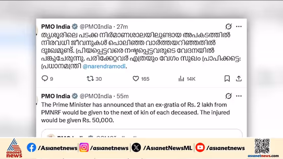 തൃശ്ശൂരിലെ ദുരന്തത്തിൽ അനുശോചനം രേഖപ്പെടുത്തി പ്രധാന മന്ത്രി, ദുരന്തത്തിൽ മരിച്ചവരുടെ കുടുംബത്തിന് രണ്ട് ലക്ഷം ധനസഹായം പ്രഖ്യാപിച്ചു, അനുശോചിച്ച് മുഖ്യമന്ത്രിയും ദേശീയ നേതാക്കളും